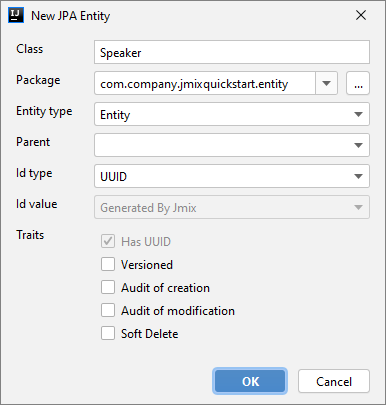 在 Jmix 的可视化设计器中,您需要提供实体名称,选择 ID 类型(UUID、Long、Integer、String 或者嵌入类),然后选择需要支持的功能: