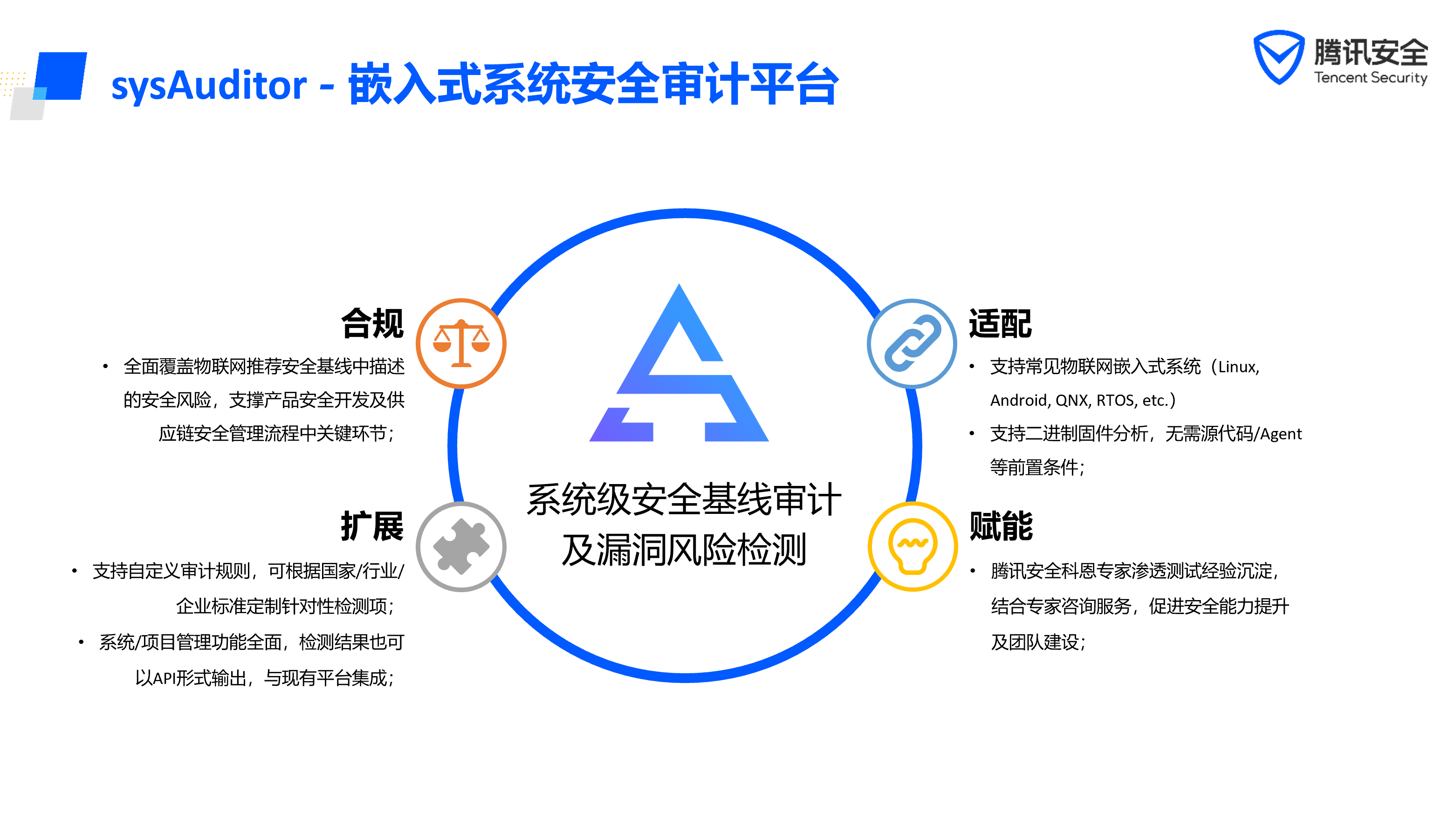 张康认为,如果把安全基本原则做好了,系统就已经处在相对比较高的安全等级。同时,结合一些漏洞扫描、检测的自动化工具应用到安全开发流程中,可以进一步提升安全能力。他介绍了腾讯安全研发的嵌入式系统安全审计平台sysAuditor。作为一款自动化检测工具,sysAuditor沉淀了科恩实验室的渗透测试经验,可以帮助企业实现国家、行业、企业自身多个层面的安全基线合规,检测结果以API的形式输出,可以与现有平台集成。
