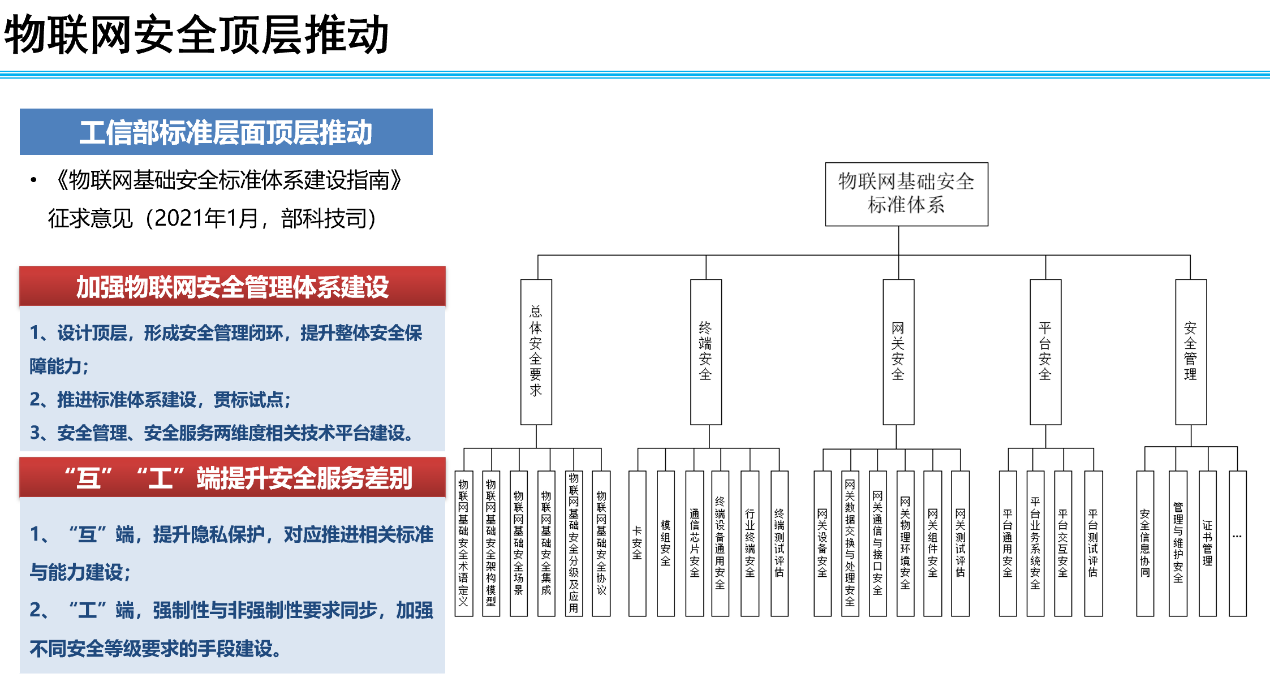 一是明确基线。对于物联网的应用来讲,不同安全应用的场景去提出不同安全级别的安全防护基本要求。