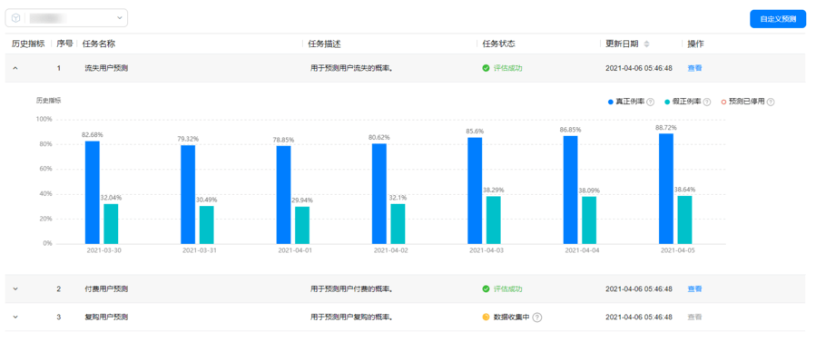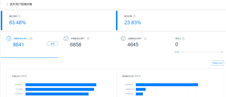 使用预测服务前,需要先集成华为分析服务的SDK,这样系统才可以顺利开展流失、付费、复购以及自定义预测任务。在详情界面可以查看相关预测人群的高中低概率对应人群数量,及其相应的属性分布(比如详情页的高概率流失人群,表示该人群在未来7日内有较高概率流失,您可以通过相关卡片,观察其行为特点并制定针对性运营计划)。