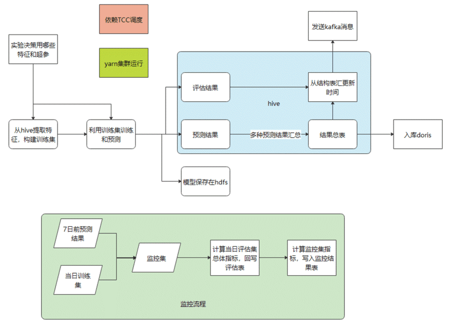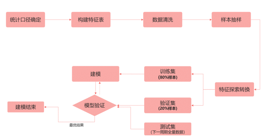 在构建预测模型的时候,首先是确定我们要预测什么,即确立预测的统计口径,然后根据统计口径围绕用户特点寻找对应相关的特征,通过清洗和采样得到数据集。我们把数据集二八分得到训练集和验证集,在线下进行不断实验找到最优特征和参数,最后根据相关数据在线上调度训练预测任务。