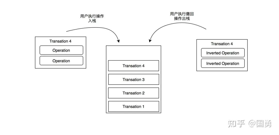 上面讲过,针对数据层的修改叫做 op,而多个 op 组合在一起叫 Transation。要做 undo 时就简单了,undo/redo 本身就是一个记录栈,每次把操作往栈里放,当用户 ctrl+z 撤销操作时,则从栈顶取出一个操作,并找出反操作执行就可。