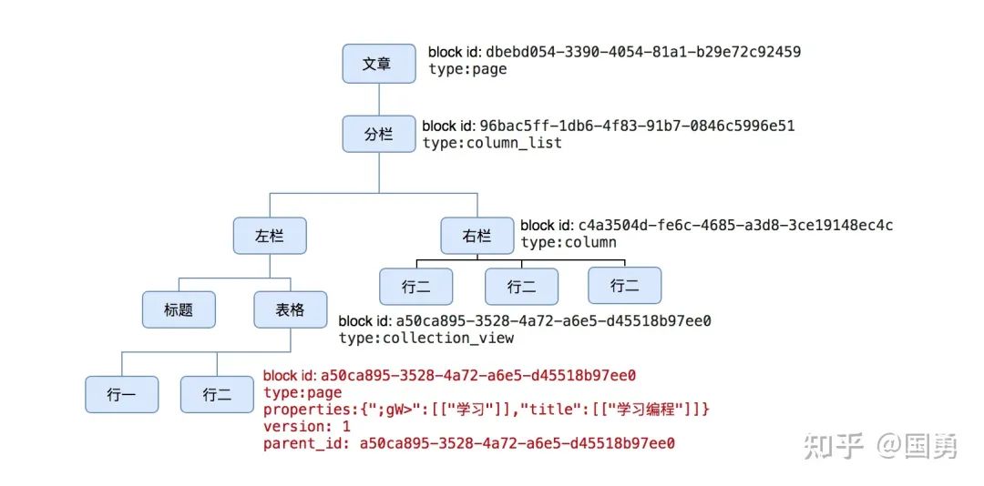 在 notion 里一切都为 block,表格、图片、文字段落等,block 通过 parent_id 来指向父 block,以此表达层级,如文章下有段落、表格、表格下有行、分栏下又可以圈套表格等。通过这种层级关系,就形成一棵 block-tree。一个 block 最基本的几个属性为: