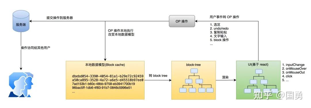 notion 也自定义数据层,设计了基于 Block-tree 的数据模型;渲染层用 React 把数据渲染成 html;使用 React 提供的事件(onInput\onCopy\onCut)或者工具条接收用户的操作指令,用户指令转换成 op;操作经过执行并修改数据模型 ,op 也会实时提交到服务端中改变后端数据库中的数据;服务端通过协同把 op 传给其他用户,达到一起编辑同一篇文章目的。