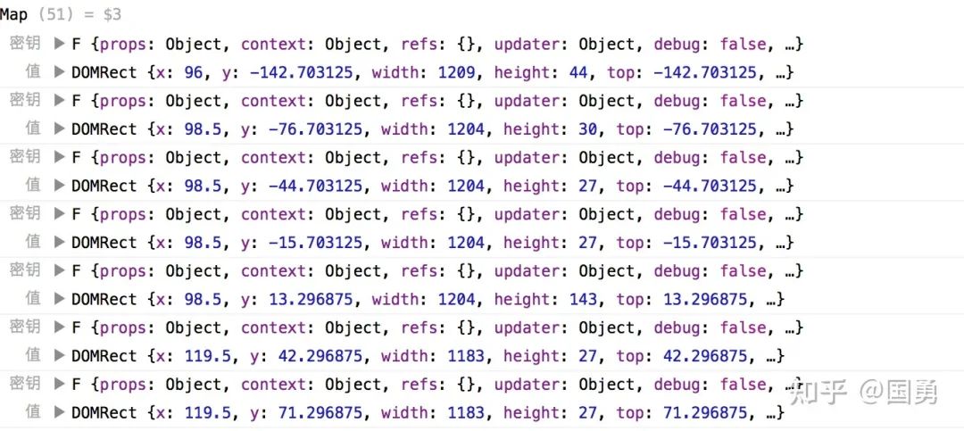 缓存 map 里记录了上图所示的 React 的渲染组件实例和 react 组件渲染出 dom 元素的位置,有 x、y 坐标、以及他的宽和高。