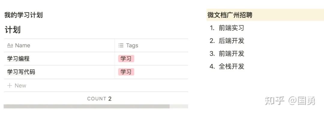 上图为 notion 的一篇两栏的文章,左栏为标题加一个表格;右栏为四行文字.