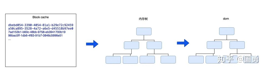 表现层的渲染大致流程为,第一步从服务端取出当前页的子 block 存放在 block cache 内存中,第二步从最顶上的 block 依次递归到叶子节点进行渲染。
