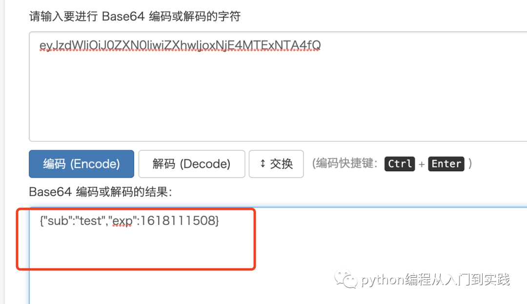 2. 子串"eyJzdWIiOiJ0ZXN0IiwiZXhwIjoxNjE4MTExNTA4fQ"的解析结果为: