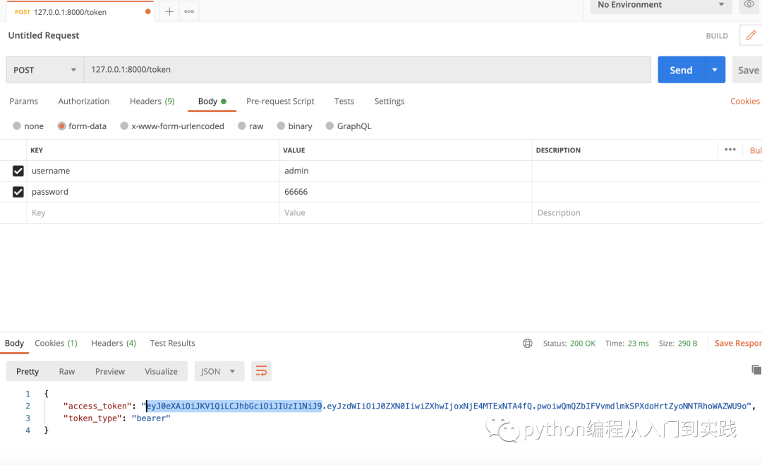from datetime import datetime, timedeltafrom typing import Optionalfrom fastapi import Depends, FastAPIfrom fastapi.security import OAuth2PasswordBearer, OAuth2PasswordRequestFormimport jwtfrom pydantic import BaseModel# to get a string like this run:# openssl rand -hex 32SECRET_KEY = "09d25e094faa6ca2556c818166b7a9563b93f7099f6f0f4caa6cf63b88e8d3e7"ALGORITHM = "HS256"ACCESS_TOKEN_EXPIRE_MINUTES = 30class Token(BaseModel):access_token: strtoken_type: strapp = FastAPI()# oauth2_scheme = OAuth2PasswordBearer(tokenUrl="/token")# 生成tokendef create_access_token(data: dict, expires_delta: Optional[timedelta] = None):to_encode = data.copy()if expires_delta:expire = datetime.utcnow() + expires_deltaelse:expire = datetime.utcnow() + timedelta(minutes=15)to_encode.update({"exp": expire})encoded_jwt = jwt.encode(to_encode, SECRET_KEY, algorithm=ALGORITHM)return encoded_jwt# 请求接口@app.post("/token", response_model=Token)async def login_for_access_token(form_data: OAuth2PasswordRequestForm = Depends()):access_token_expires = timedelta(minutes=ACCESS_TOKEN_EXPIRE_MINUTES)access_token = create_access_token(data={"sub": "test"}, expires_delta=access_token_expires)return {"access_token": access_token, "token_type": "bearer"}
