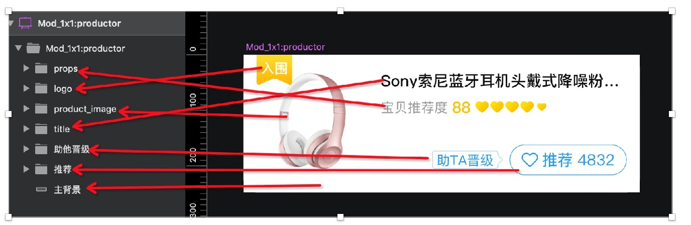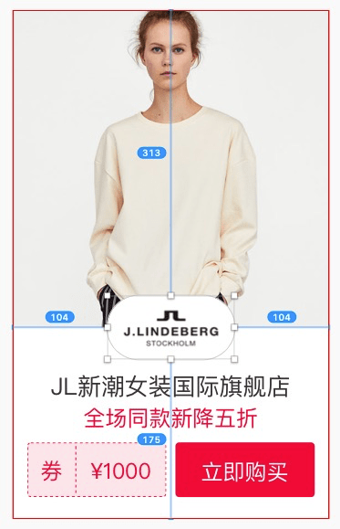 下图所示的商品 1 排 4 模块,商品图与实际图片尺寸大小不一致。商品图的大小是 113x100,真实图片为一张方图,尺寸是 156 * 156,所以在商品图下添加了一个 Mask,标记真实图片的尺寸。