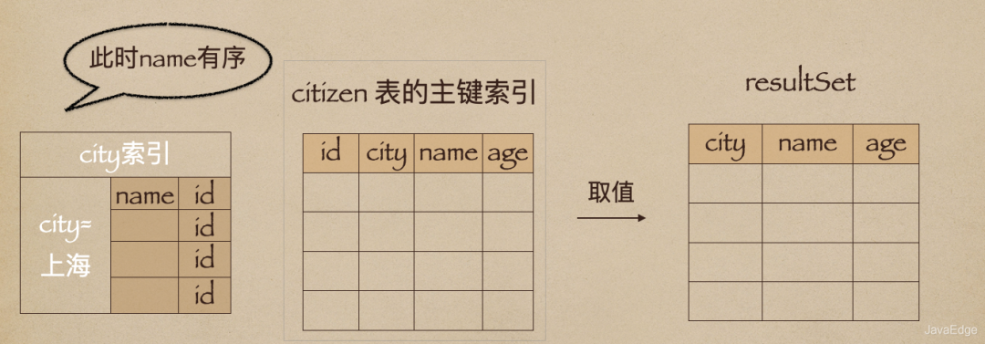 新的算法放入sort_buffer的字段,只有要排序的列(即name字段)和主键id。但这时,排序的结果就因少了city和age字段值,不能直接返回了,整个执行流程变成如下: