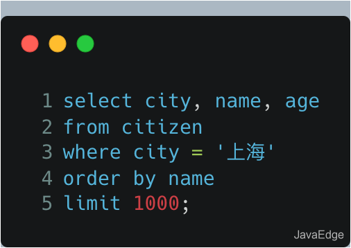 mysql> select city, name,age from citizen where city='上海' order by name limit 1000;+--------+------+-----+| city | name | age |+--------+------+-----+| 上海 | java | 22 |...