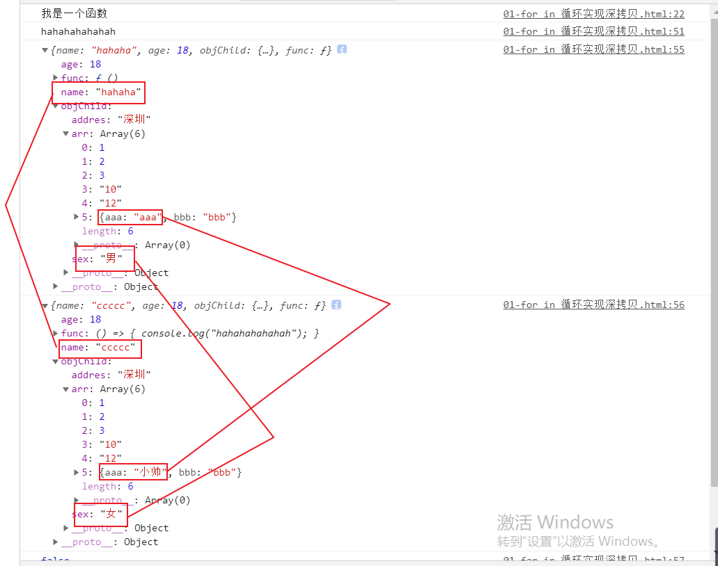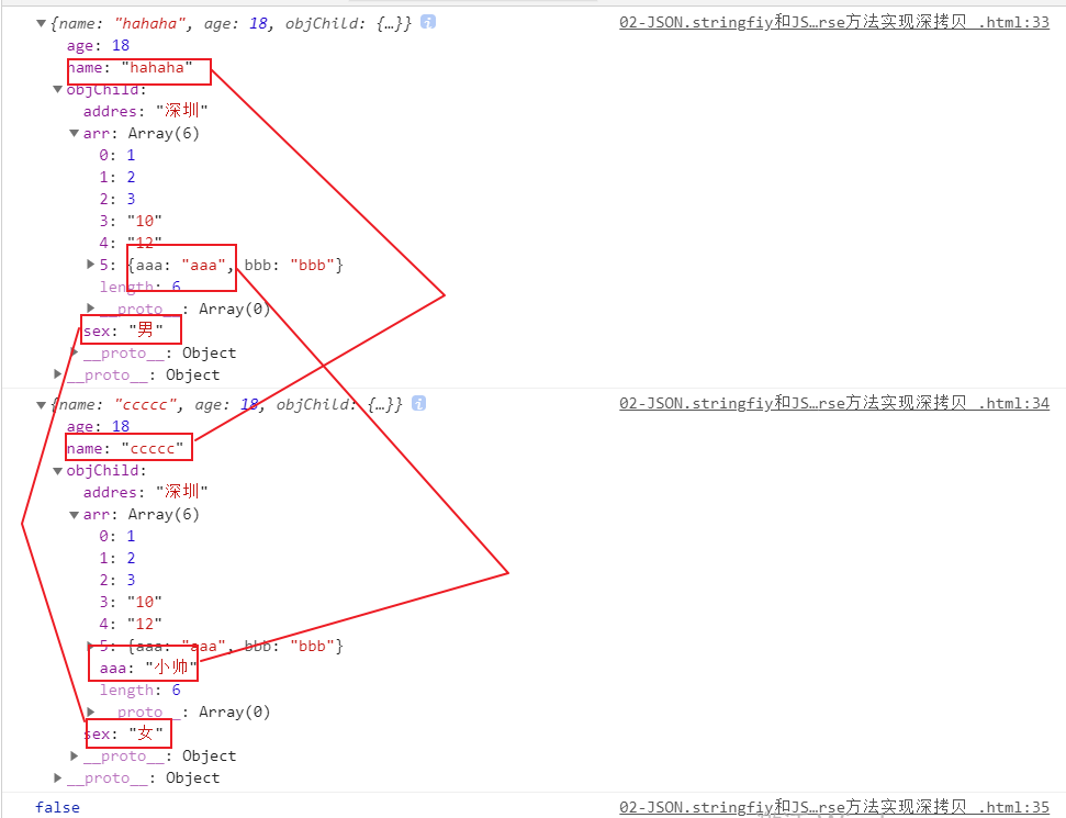 输出结果:可以看到拷贝后的修改并没有影响到原先 对象 ,新的对象的引用地址已经改变,与原先对象属于两个不同对象,此时 console.log(newObj === obj); // false