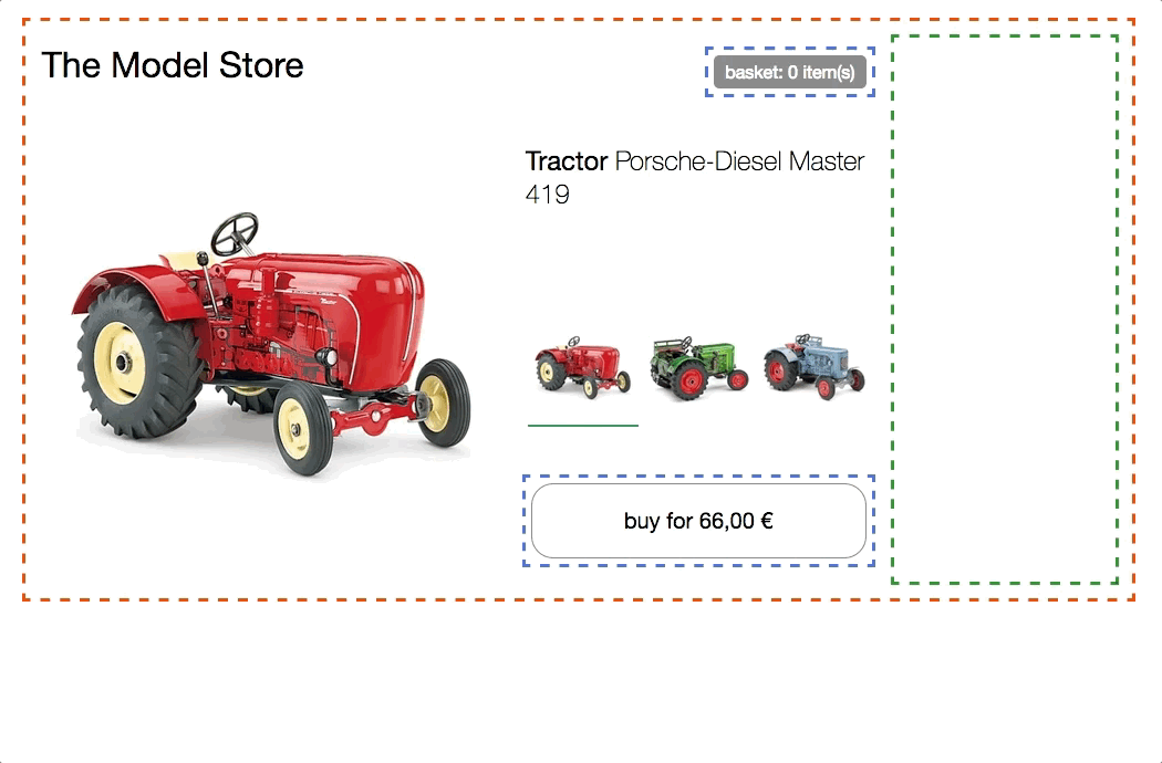 它具有一个变体选择器,可以在三种不同的拖拉机型号之间进行切换。更改产品图片时,名称,价格和建议会更新。还有一个“购买”按钮,将选择的变体添加到购物篮中,并在顶部增加一个迷你购物篮,并相应地进行更新。