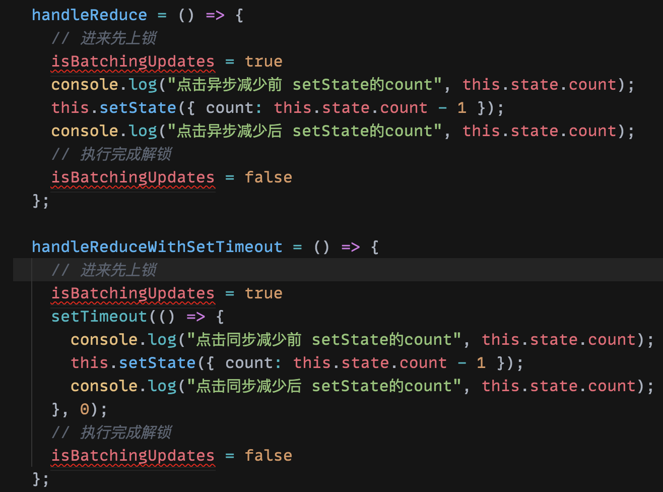 - 也就是当 setState 调用真正执行的时候,isBatchingUpdates已经被置为false,使得当前场景下 setState 具备了立刻发起同步更新的能力