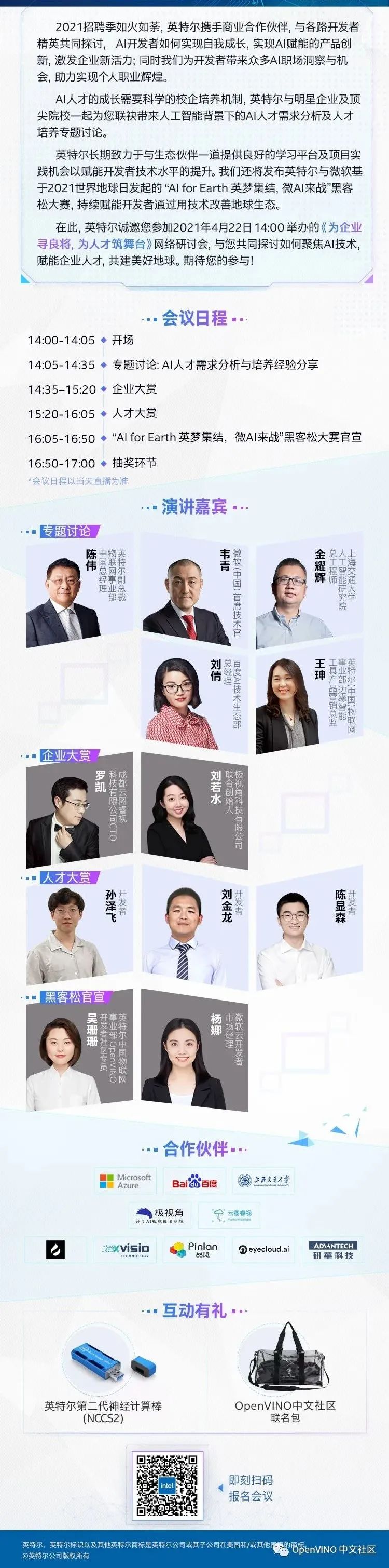 4 月 22 日,英特尔将携手商业合作伙伴,带来“为企业寻良将,为人才筑舞台”直播活动。以期与各路英雄共同探讨,AI 开发者如何实现自我成长,实现 AI 赋能的产品创新,激发企业新获利;同时主办方也将为开发者带来众多 AI 职场洞察与机会,助力实现个人职业辉煌。