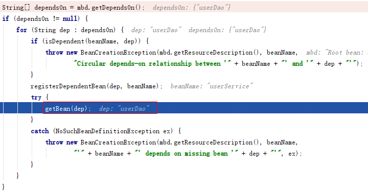 涉及到依赖会走到 dependsOn != null 下,获取到依赖的 Bean 实例。