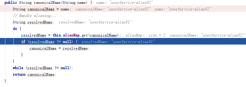 在单元测试 getBean 的时候,会看到它会把别名逐步处理掉,最终获取到原有的 BeanName