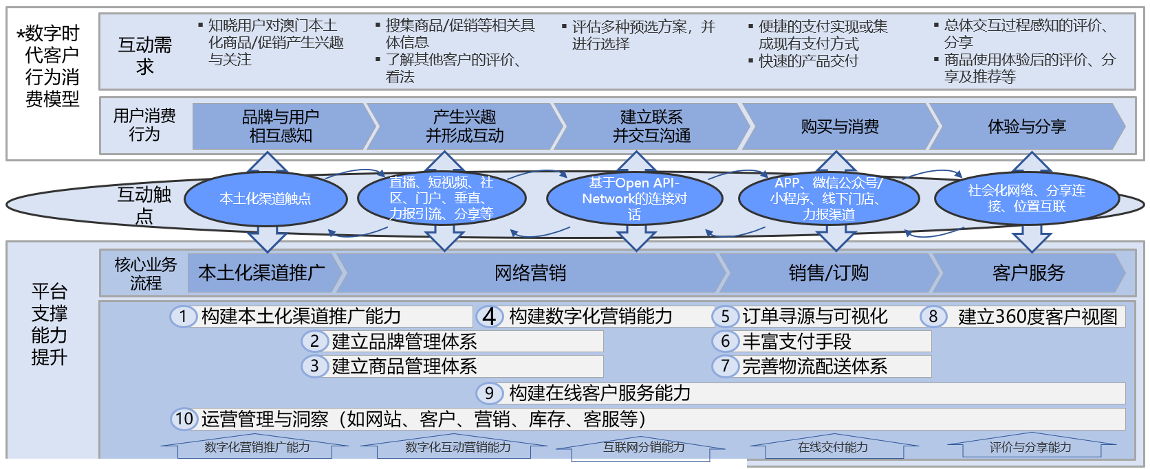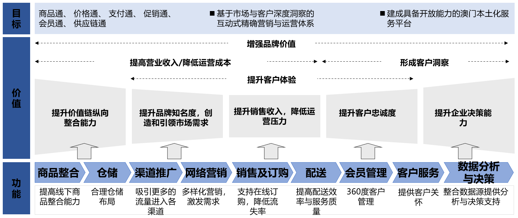 主要是通过形成客户洞察,提升客户体验,增加品牌影响力,从而增加销售收入并降低运营成本。需要建设具备线上线下(O2O)整合销售、协同商品及价格、协同营销、统一会员管理、多元化/品牌利益分配以及决策能力的整合的澳门本土化服务平台。
