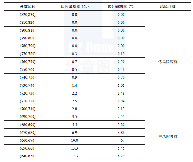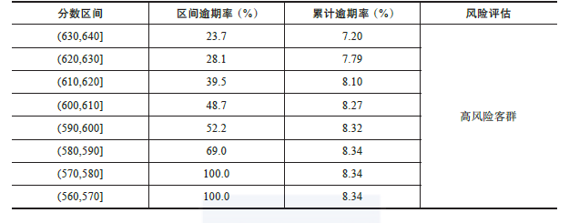 对于借款人风险的评估,主要还是从综合欺诈和信用两个方面入手。对于存在欺诈风险和高信用风险的客户,平台一般不授予其贷款额度;对于信用风险较低的客户,风控人员会利用申请评分卡量化其风险水平,将不同的人匹配到不同的区间内,实现风险分层的目的,指导下一步的差异化定价。风险分层如表1所示,其中申请评分卡700分以上的为低风险客群,640分以下的为高风险客群,640~700分的为中风险客群。