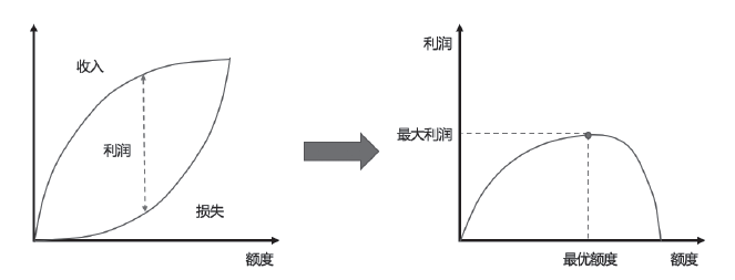 上述的差异化定价是一种比较理想的情况,其中忽略了一些实际工作中存在的变量,这就要求专业的风控人员具备让整体利润最优的能力,也就是风险管理流程中的“第三级火箭”。在实际操作中,客户对于贷款额度通常比较敏感,额度过低没有吸引力会导致客户的支用意愿不强,减少机构的收入;额度过高超过借款人还款能力又会增大客户逾期的风险,给机构带来不必要的损失。因此,机构的整体利润会随着额度的增加先增大再减小,如何找到额度的最优解,是风控人员需要解决的实际问题。额度与利润的关系如图3所示。
