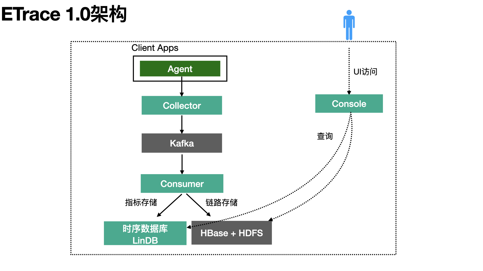 ETrace整体架构如下图。通过SDK集成在用户应用中的Agent定期将Trace数据经Thrift协议发送到Collector(Agent本地不落日志),Collector经初步过滤后将数据打包压缩发往Kafka。Kafka下游的Consumer消费这些Trace数据,一方面将数据写入HBase+HDFS,一方面根据与各中间件约定好的埋点规则,将链路数据计算成指标存储到时间序列数据库-- LinDB中。在用户端,Console服务提供UI及查询指标与链路数据的API,供用户使用。