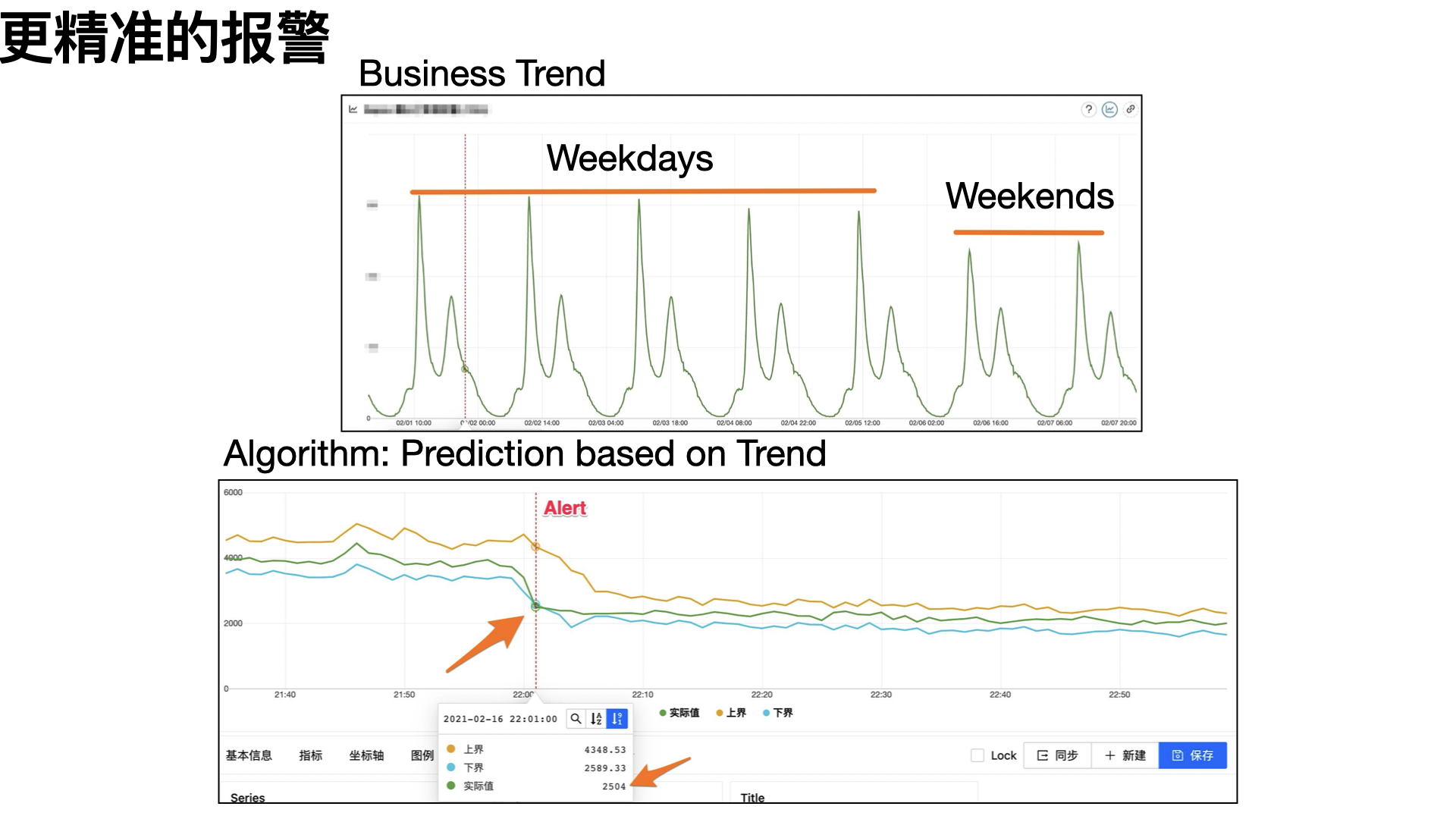 如上图所示,22点01分的实际值因不在上下界所限定的区域之中,会触发报警。但从后续趋势来看,该下降趋势符合预期,因此实际中还会辅以“偏离持续X分钟”来修正误报。(如该例中,可增加“持续3分钟才报警”的规则,该点的数据便不会报警)算法中部分参数为经验值,而其中波动的阈值参数用户可按照自己业务调整。用户针对具备业务特征的曲线,再也不用费心的去调整参数,配置上默认的“趋势”规则就可以覆盖大多数的可观测性场景,目前“趋势”报警在饿了么广泛运用。