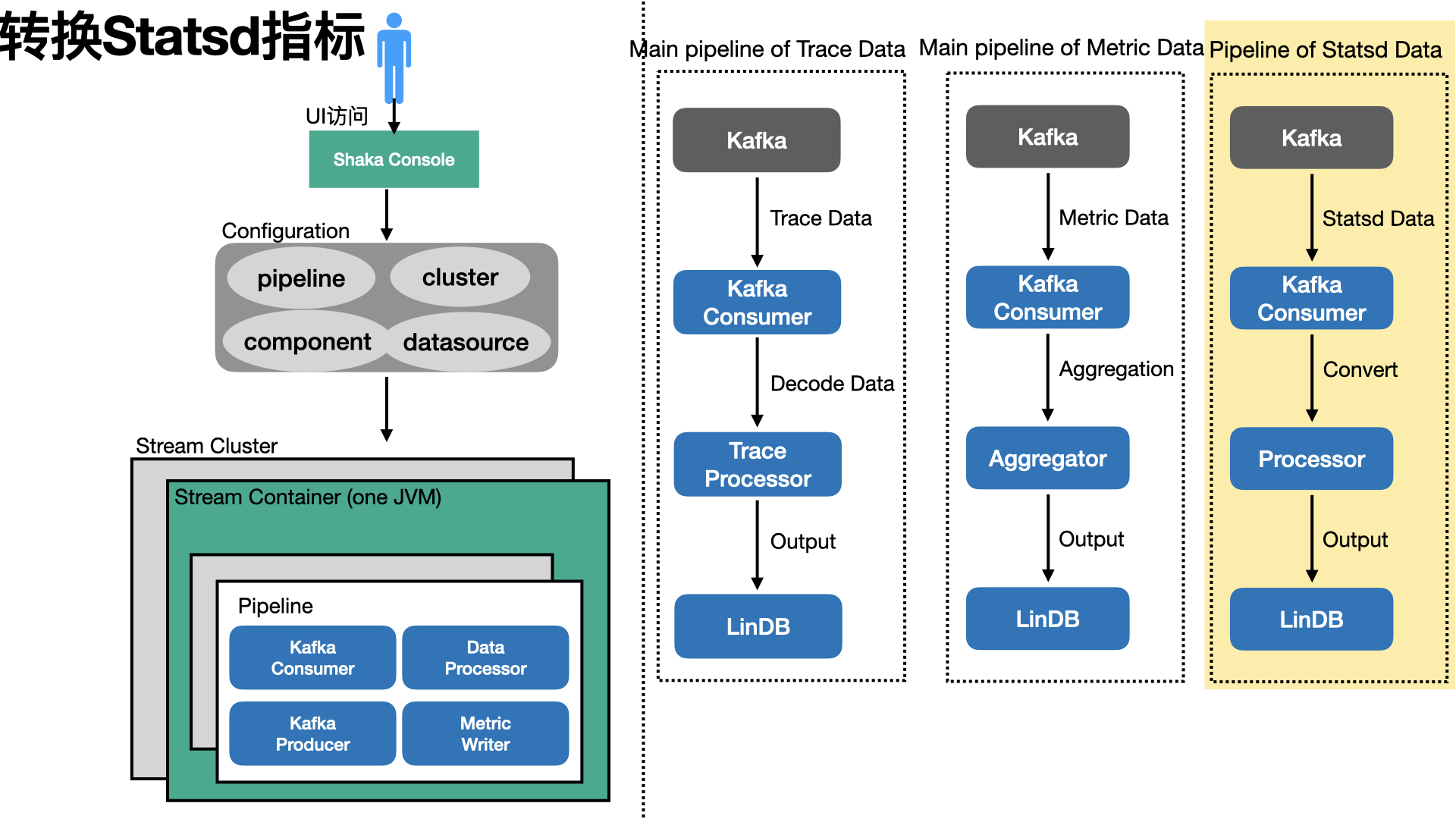 之前我们的实时计算模块Shaka就在这里派上了大用场:只要再新增一路数据处理流程即可。如下图,新增一条Statsd数据的处理Pipeline,并输出结果到LinDB。在用户的代码全部从Statsd API迁移到ETrace API后,这一路处理逻辑即可移除。