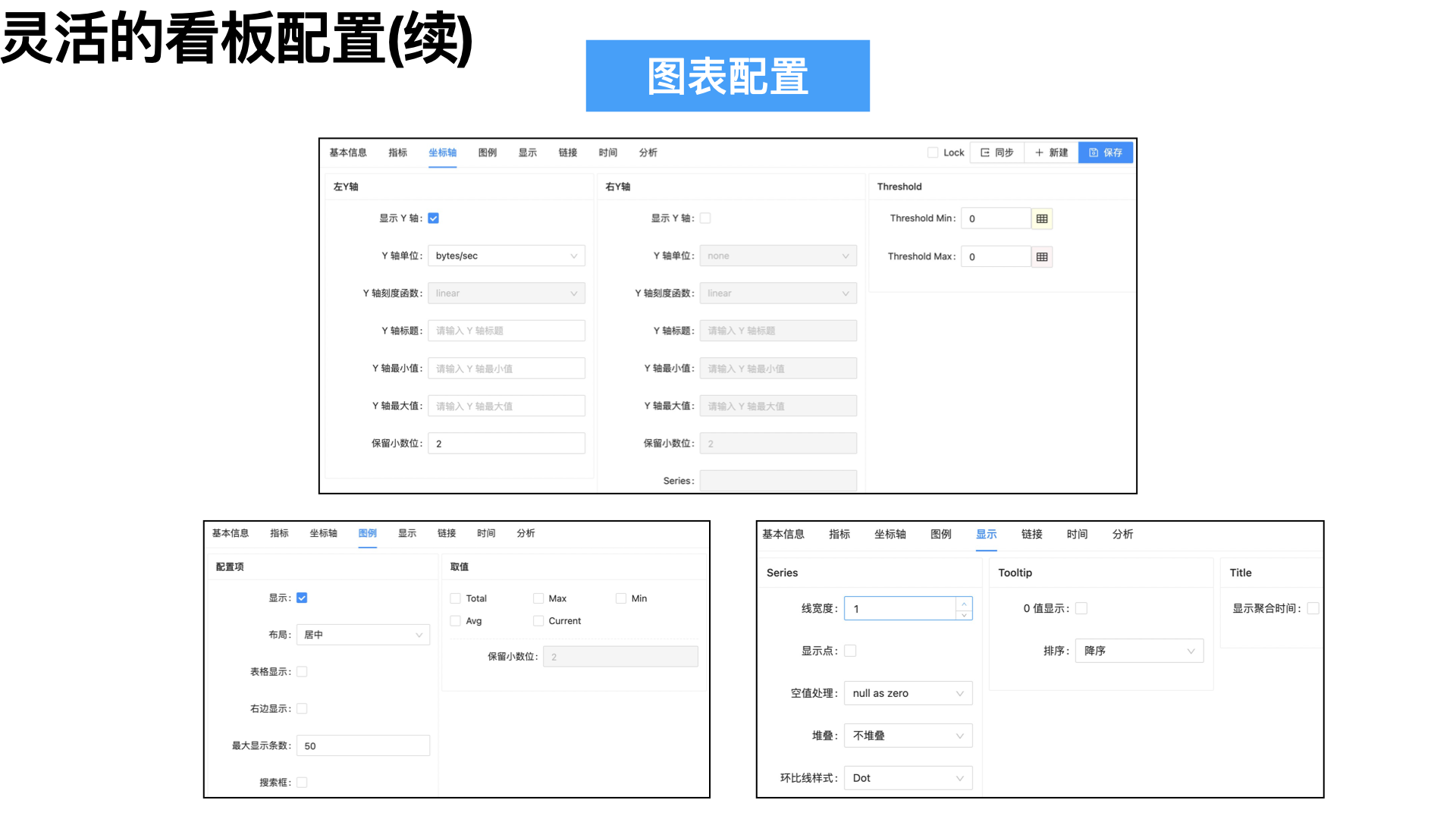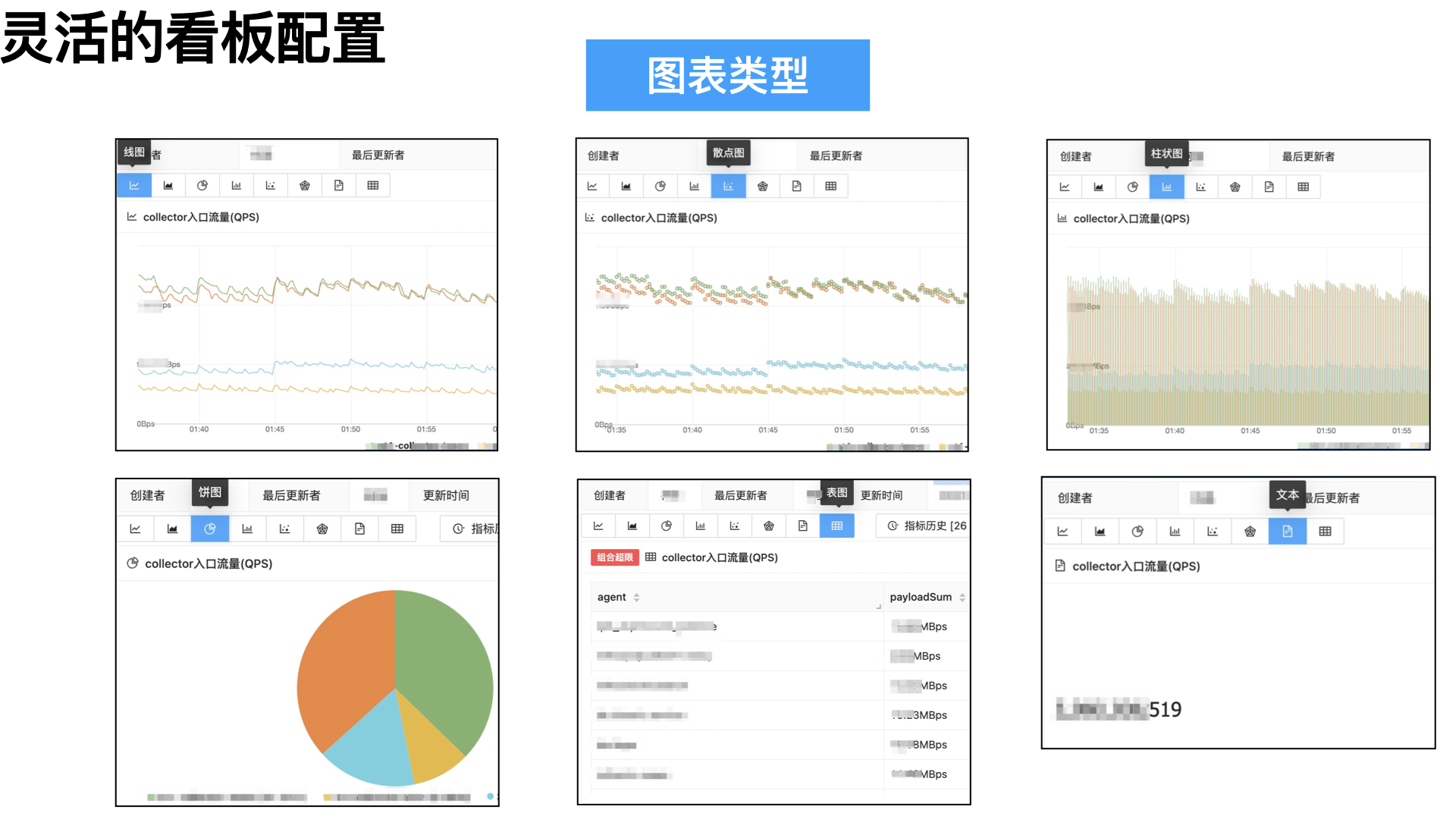 在指标配置上,我们提供了多种图表类型--线图、面积图、散点图、柱状图、饼图、表格、文本等,以及丰富的自定义图表配置项,能满足用户不同数据展示需求。