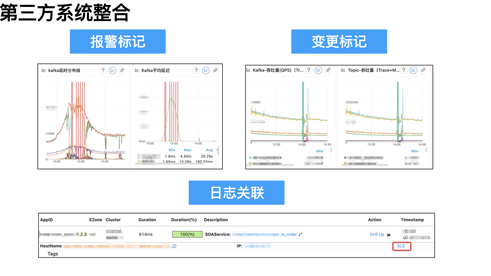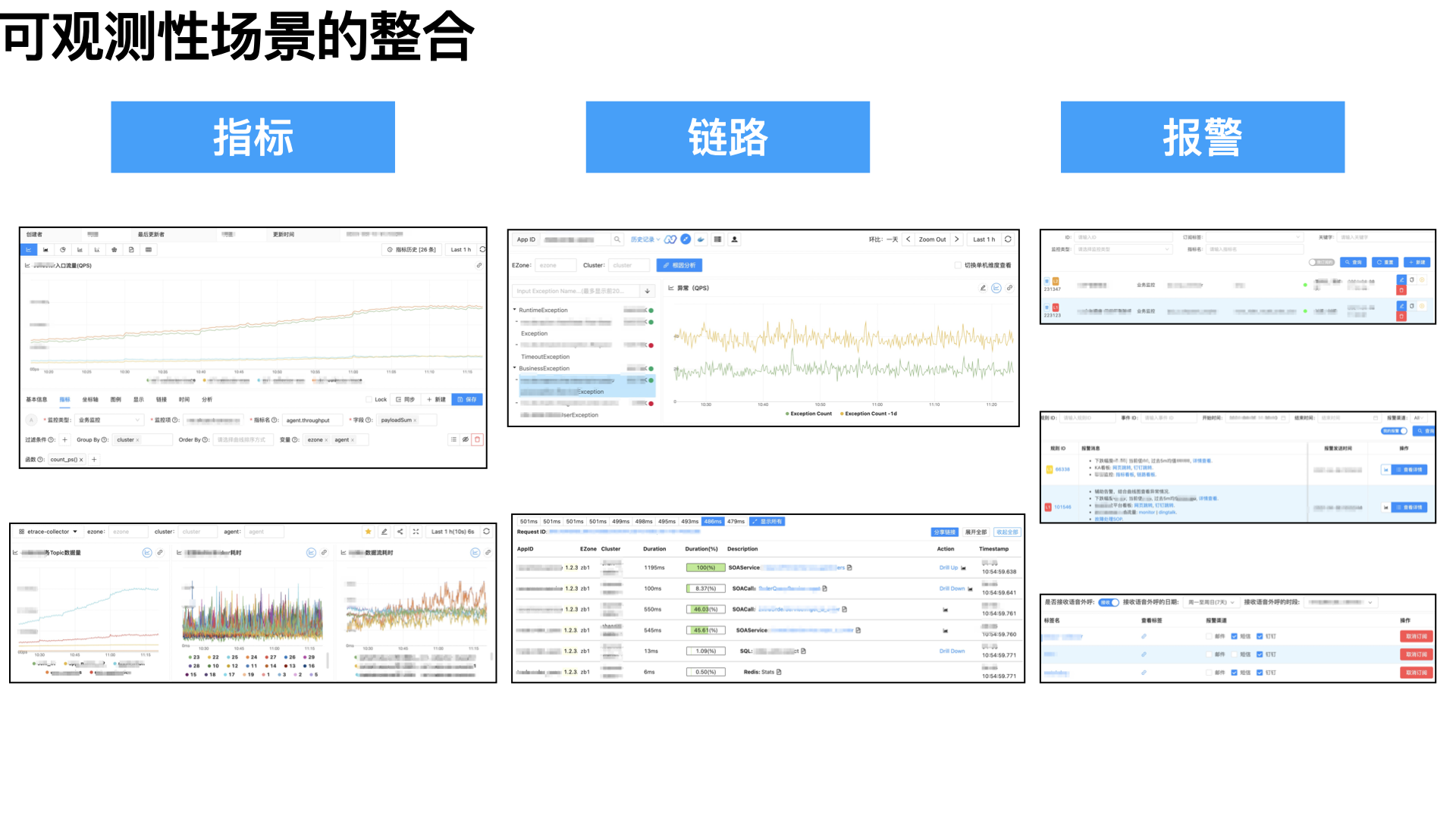 在可观测性场景上,“指标看板”用于日常业务盯屏与宏观业务可观测性,“链路”作为应用排障与微观业务逻辑透出,“报警”则实现可观测性自动化,提高应急响应效率。