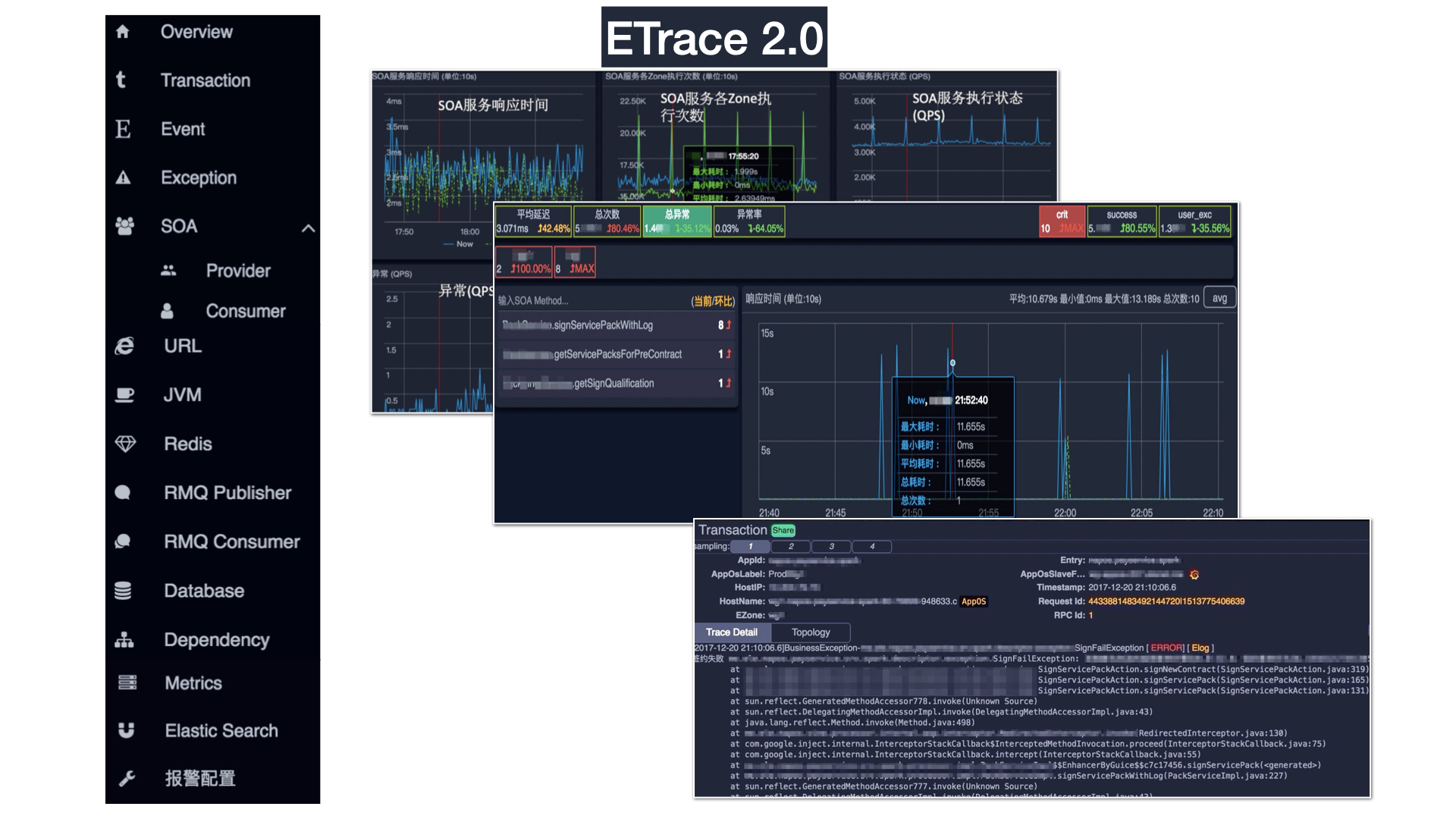 我们可观测性团队,在调研业界主流的全链路可观测性产品--包括著名的开源全链路可观测性产品“CAT”后,吸取众家之所长,在两个多月的爆肝开发后,推出了初代ETrace。我们提供的Java版本ETrace-Agent随着新版的饿了么SOA框架“Pylon”在饿了么研发团队中的推广和普及开来。ETrace-Agent能自动收集应用的SOA调用信息、API调用信息、慢请求、慢SQL、异常信息、机器信息、依赖信息等。下图为1.0版本的ETrace页面截图。