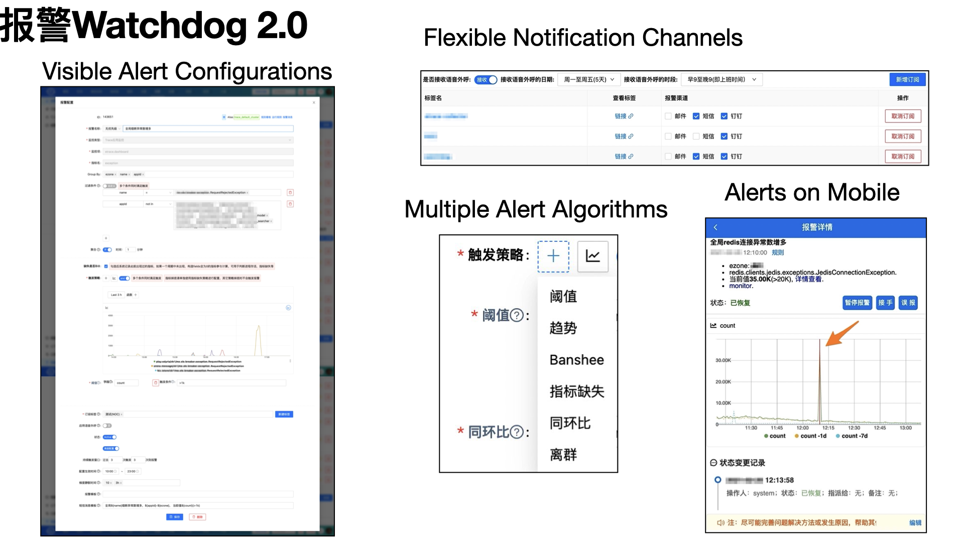 同样在EMonitor之前,亦有Statsd与InfluxDB对应的多套报警系统。用户若想要配置业务报警、链路报警、机器报警,需要辗转多个报警系统之间。各系统的报警的配置规则、触达体验亦是千差万别。Watchdog报警系统也面临着统一融合的挑战。
