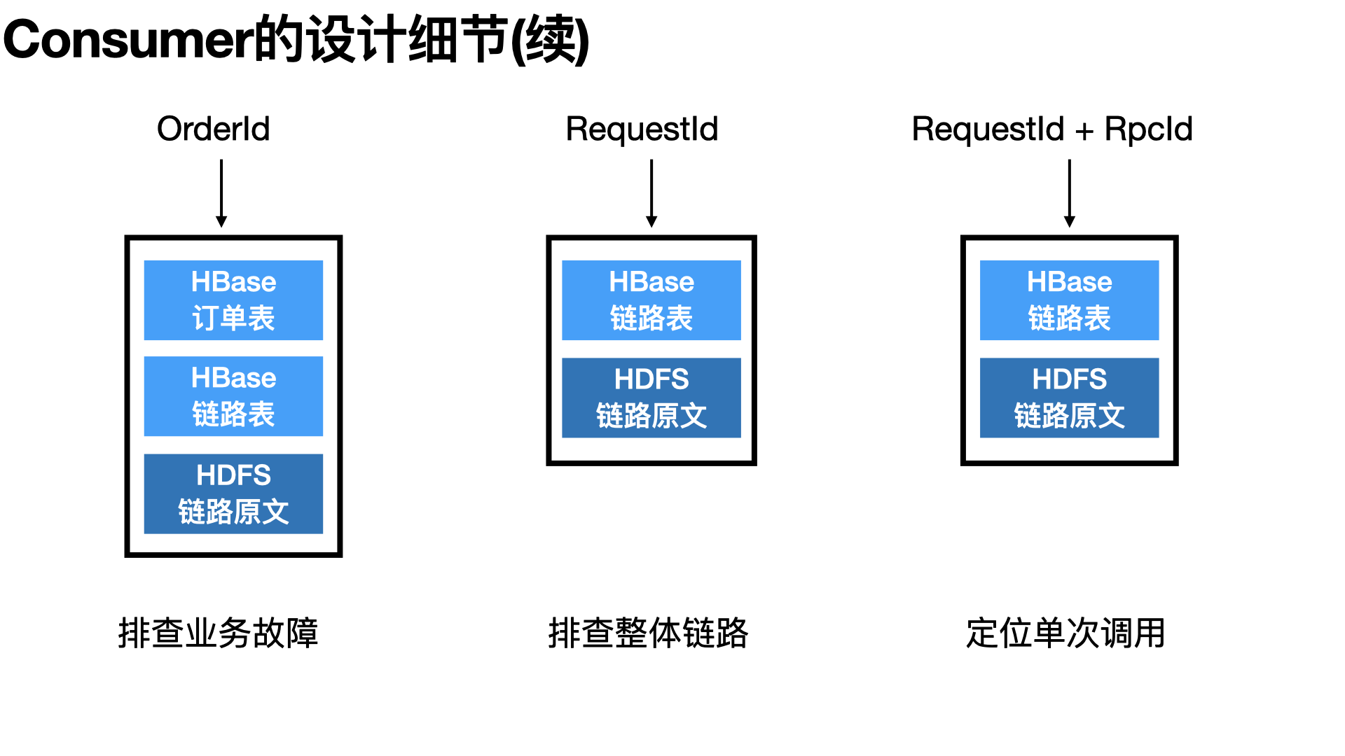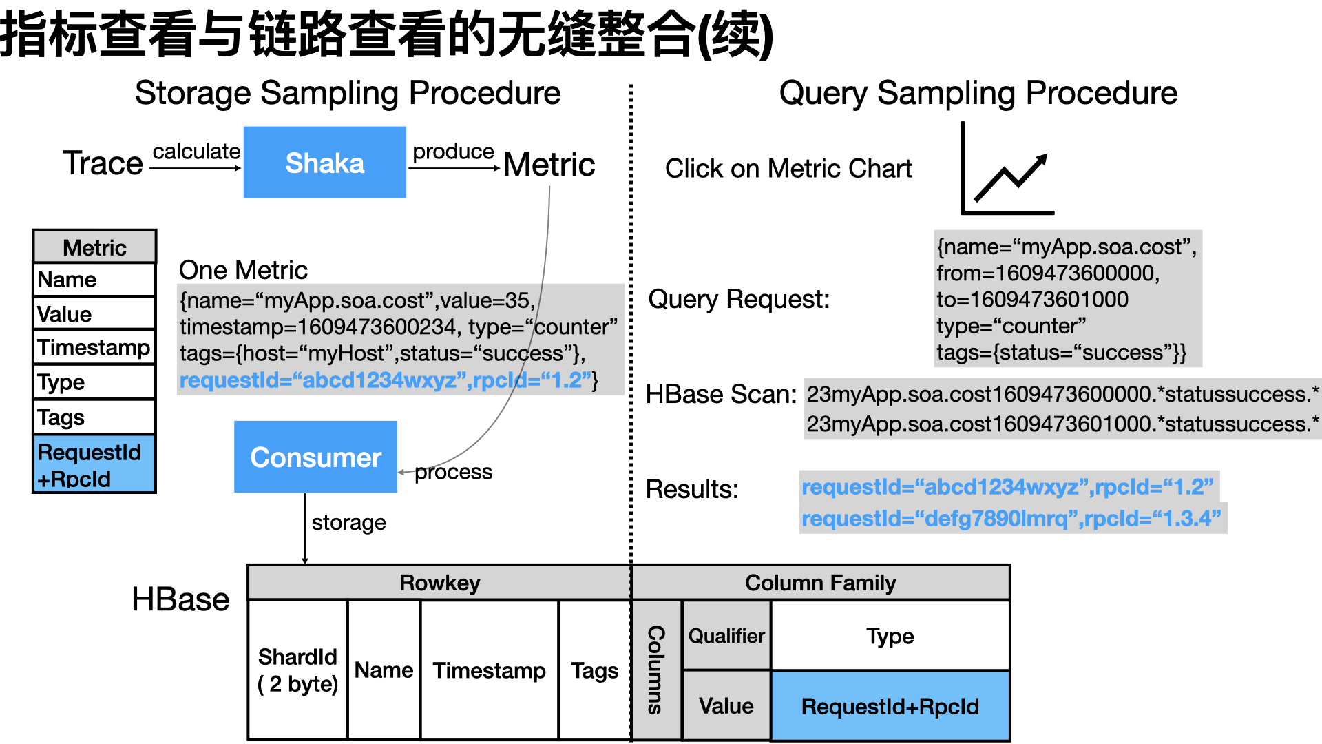 它的实现原理如上图所示。具体的,前文提到的实时计算模块Shaka将Trace数据计算成Metric数据时,会额外以抽样的方式将Trace上的RequsetId与RpcId也写到Metric上(即上文Esper语句中,生成的Metric中的sampling字段)。这种Metric数据会被Consumer模块消费并写入到HBase一张Sampling表中。