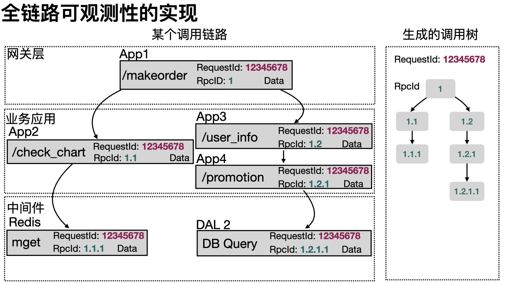 所谓全链路可观测性,即每次业务请求中都有唯一的能够标记这次业务完整的调用链路,我们称这个ID为RequestId。而每次链路上的调用关系,类似于树形结构,我们将每个树节点上用唯一的RpcId标记。