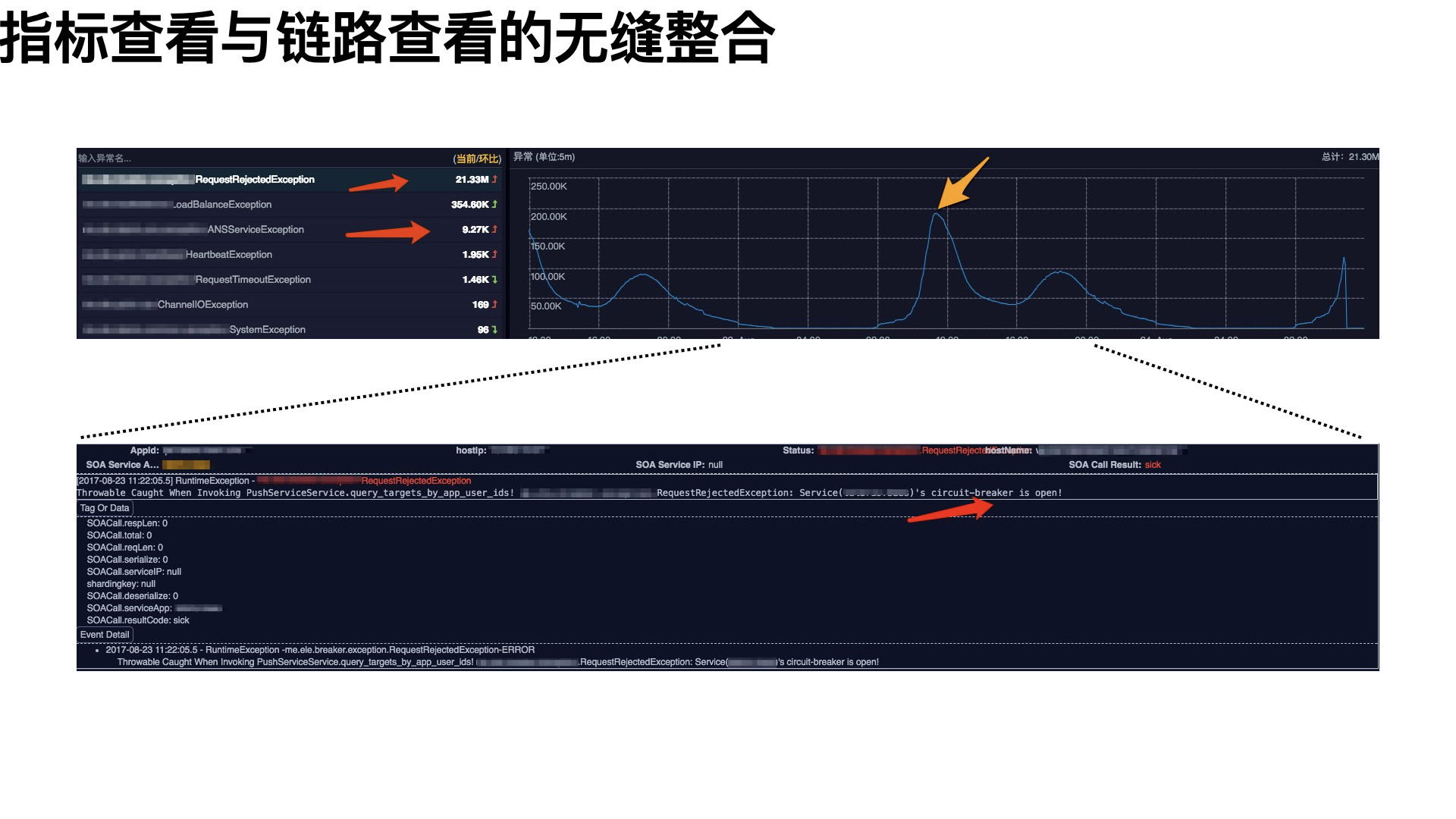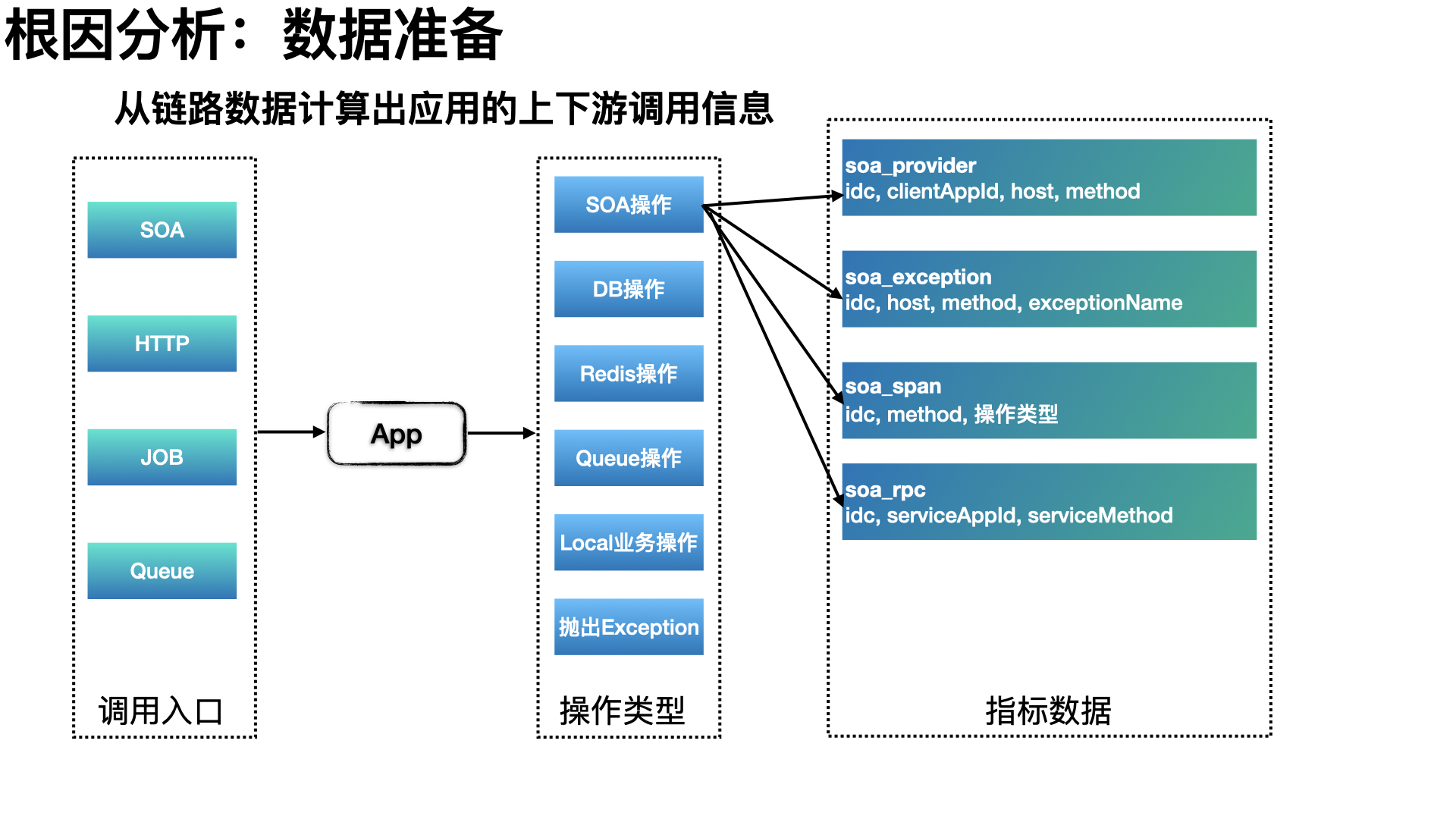 其次,在链路数据计算时,我们就能将额外的上下游附加信息附加到对应的指标之中。如,可在异常指标中追加一个维度来记录产生异常的SOA方法名。这样在根据异常指标分析时,能直接定位到是这个应用的那个SOA方法抛出的异常,接下来“自动”分析是SOA下游故障还是自身故障(DB、Cache、GC等)。