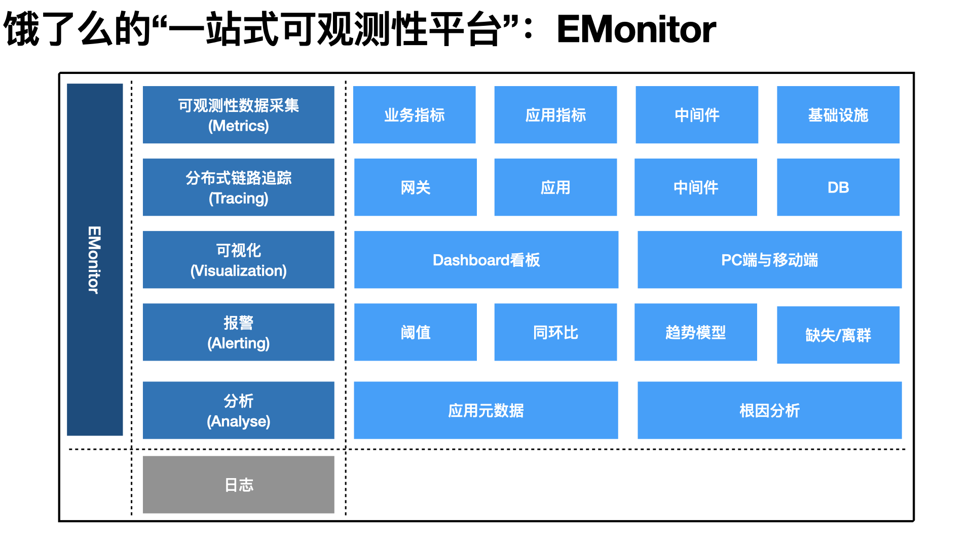 而可观测性作为技术体系的核心环节之一,也跟随饿了么技术的飞速发展,不断自我革新,从“全链路可观测性ETrace”扩展到“多活下的可观测性体系ETrace”,发展成目前“一站式可观测性平台EMonitor”。