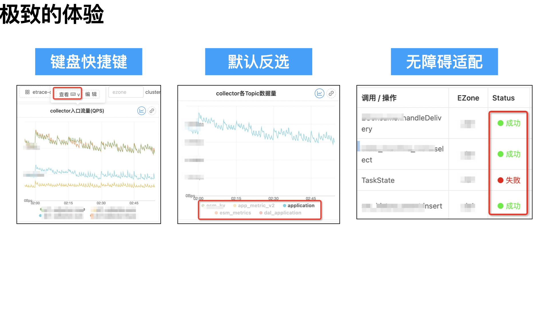 传统的可观测性系统提供的排障方式大致是:接收报警(Alert)--查看指标(Metrics)--登陆机器--搜索日志(Trace/Log),而ETrace通过Metric与Trace的整合,能让用户直接在UI上通过点击就能定位绝大部分问题,显著拔高了用户的使用体验与排障速度。