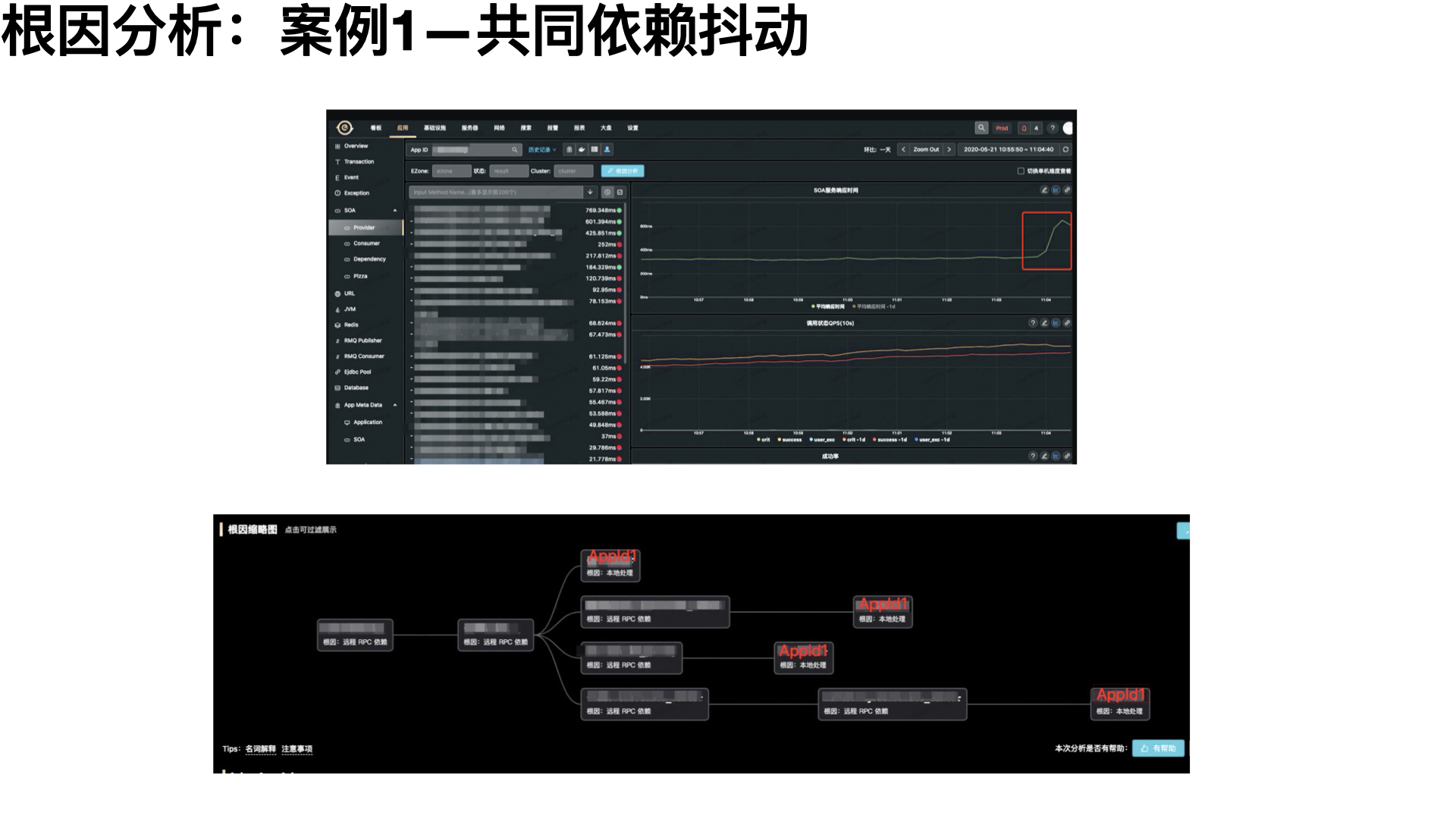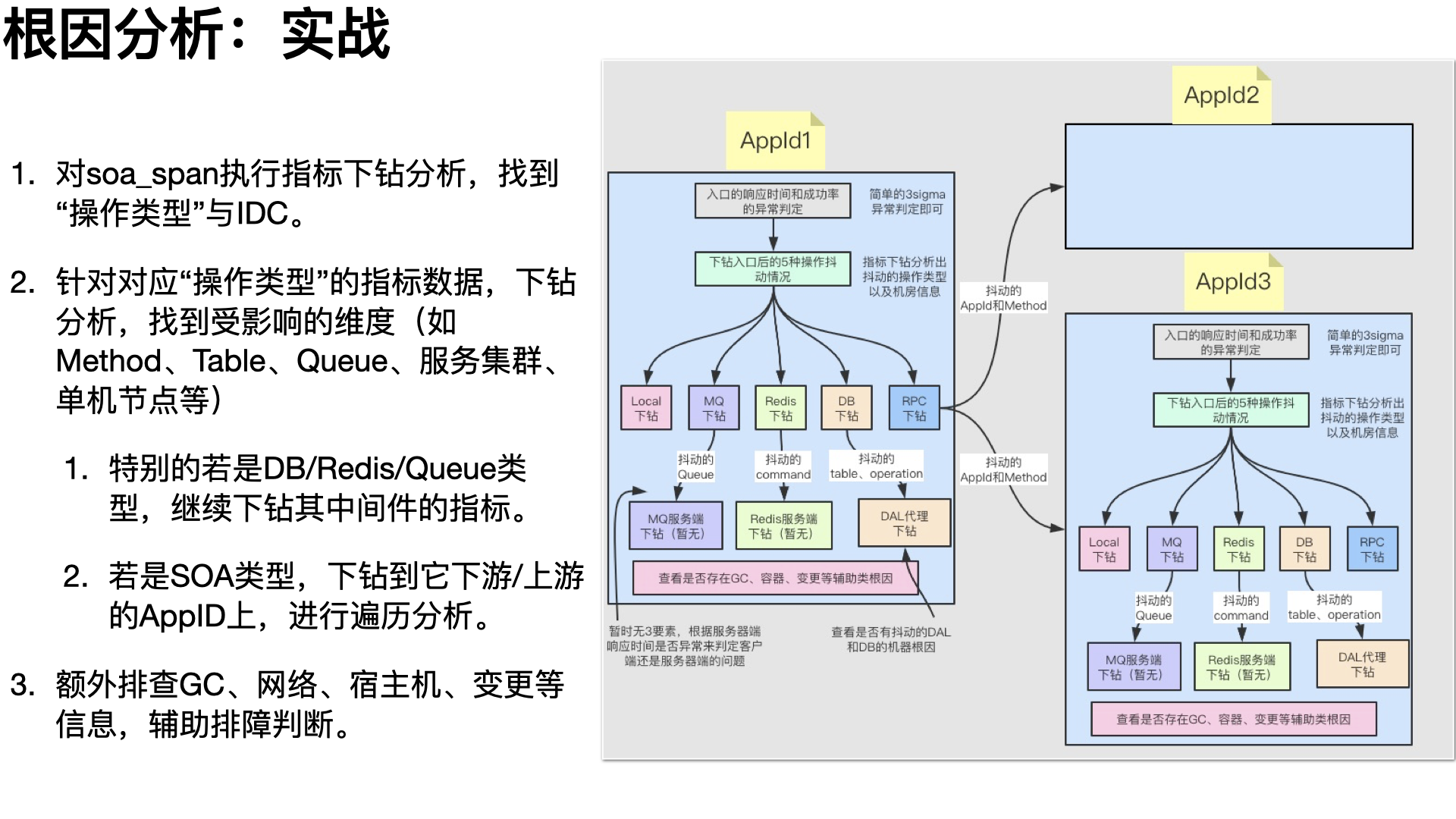 根因分析最大的难点在于:包含复杂维度的指标数据难以找到真正影响数据波动的具体维度;孤立的指标数据也难以分析出应用上下游依赖引起的故障根因。 例如,某个应用的异常指标突增,当前我们只能知道突增的异常名、机房维度的异常分布、机器维度的异常分布等,只有用户手工去点击异常指标看来链路之后,才能大致判断是哪个SOA方法/DB请求中的异常。继而用户根据异常链路的环节,去追溯上游或下游的应用,重复类似的排查过程,最后以人工经验判断出故障点。