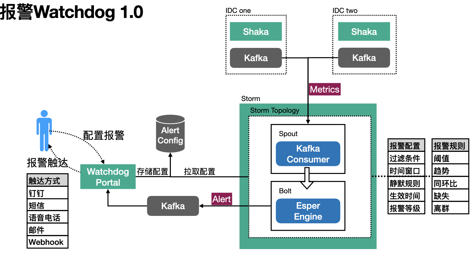 在应用可观测性基本全覆盖之后,报警的需求自然成了题中之义。技术选型上,根据我们在实时计算模块Shaka上收获的经验,决定再造一个基于实时数据的报警系统--Watchdog。