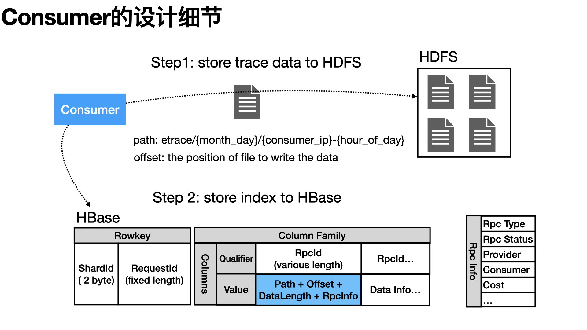 Consumer组件的核心任务就是将链路数据写入存储。主要思路是以RequestId+RpcId作为主键,对应的Data数据写入存储的Payload。再考虑到可观测性场景是写多读少,并且多为文本类型的Data数据可批量压缩打包存储,因此我们设计了基于HDFS+HBase的两层索引机制。
