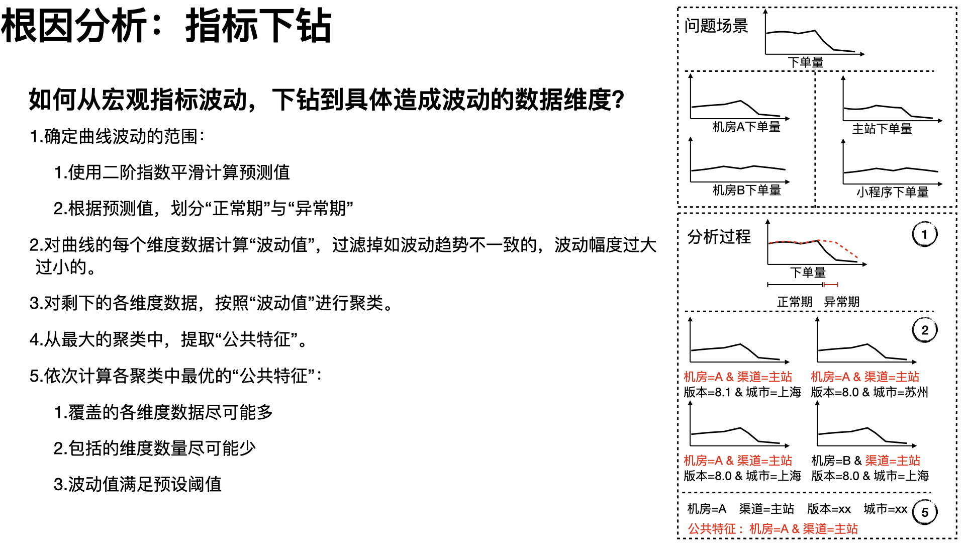 因此,在“指标下钻”上,我们针对目标指标的曲线,细分成最精细的每个维度数据(指标group by待分析的tag维度),使用KMeans聚类找出故障数据的各维度的最大公共特征,依次计算找到最优的公共特征,如此便能找到曲线波动对应的维度信息。