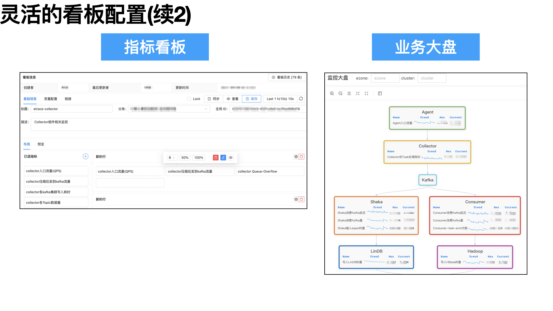 看板配置是静态图表组合,而业务大盘提供了生动的业务逻辑视图。用户可以根据他的业务场景,将指标配置整合成一张宏观的业务图。