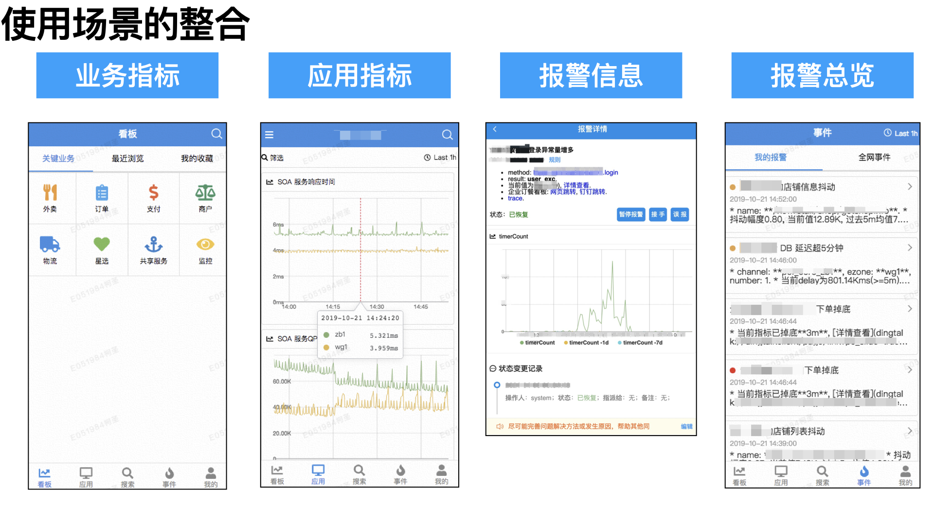 除提供桌面版的EMonitor外,我们还开发了移动版的EMonitor,它也提供了大部分可观测性系统的核心功能--业务指标、应用指标、报警信息等。移动版EMonitor能内嵌于钉钉之中,打通了用户认证机制,帮助用户随时随地掌握所有的可观测性信息。