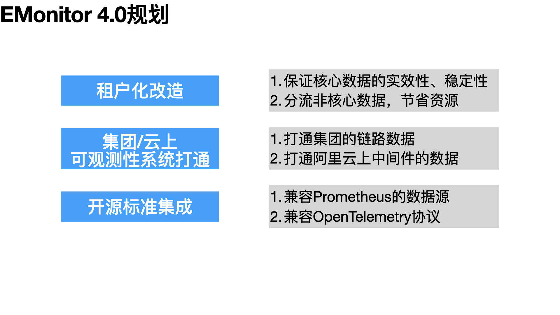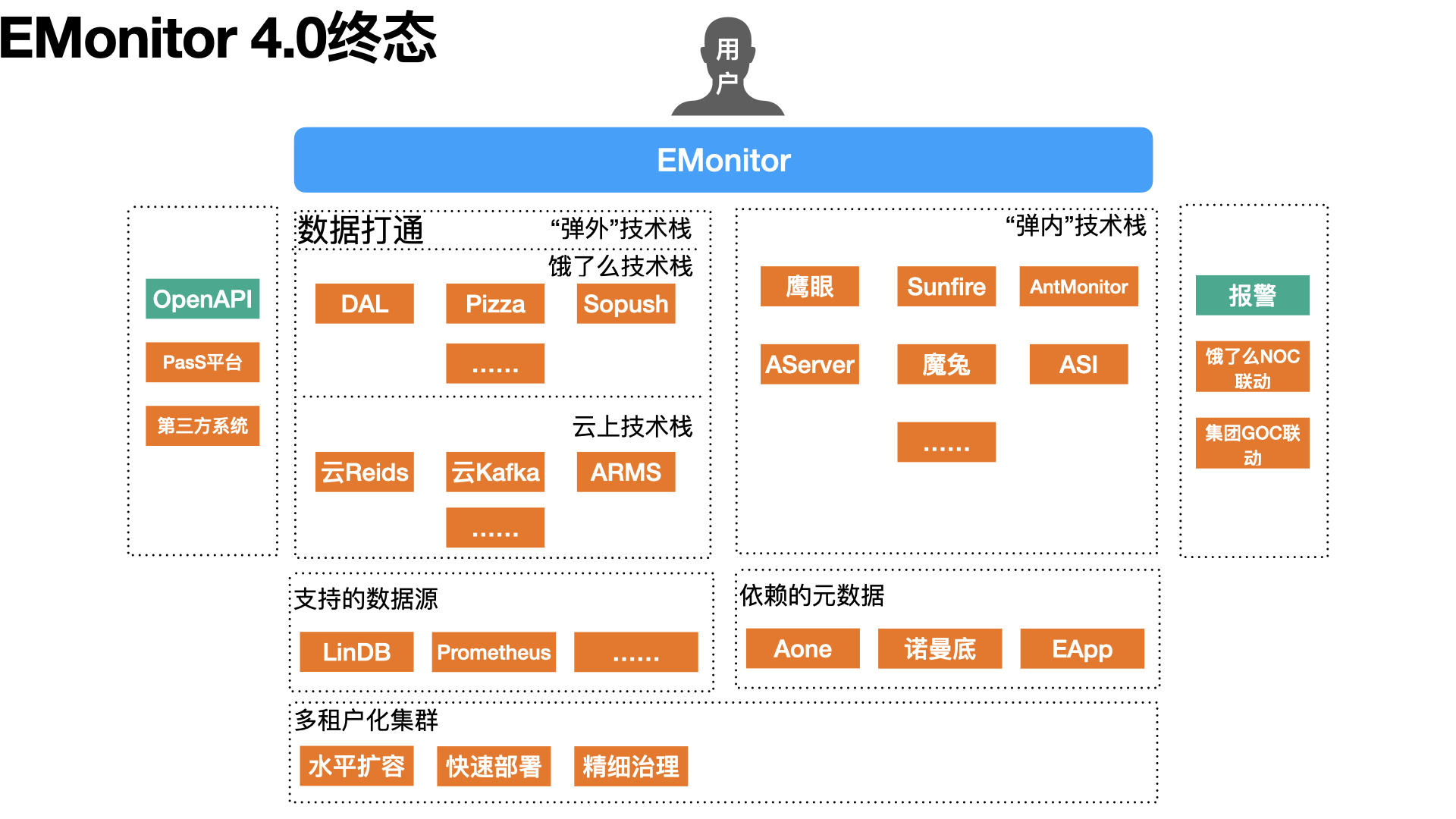 经过4、5年的发展,风云变幻但团队初心不改,为了让用户用好可观测性系统,EMonitor没有停下脚步,自我革新,希望让“天下没有难用的可观测性系统”。我们向集团的可观测性团队请教学习,结合本地生活自己的技术体系建设,力争百尺竿头更进一步,规划了以下的EMonitor 4.0的设计目标。