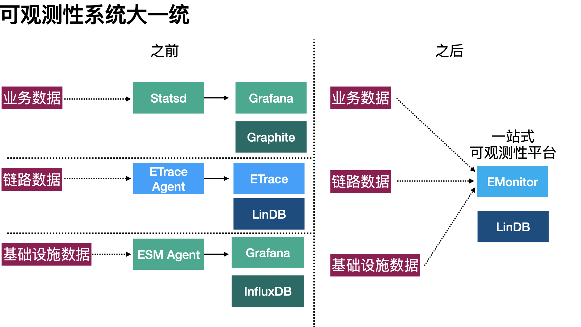 在2017年的饿了么,除了ETrace外还有多套可观测性系统:基于Statsd/Graphite的业务可观测性系统、基于InfluxDB的基础设施可观测性系统。后两者都集成Grafana上,用户可以去查看他的业务或者机器的详细指标。但实际排障场景中,用户还是需要在多套系统间来回切换:根据Grafana上的业务指标感知业务故障,到ETrace上查看具体的SOA/DB故障,再到Grafana上去查看具体机器的网络或磁盘IO指标。虽然,我们也开发了Grafana的插件来集成LinDB的数据源,但因本质上差异巨大的系统架构,还是让用户“疲于奔命”式的来回切换系统,用户难以有统一的可观测性体验。因此2018年初,我们下定决心:将多套可观测性系统合而为一,打通“业务可观测性+应用可观测性+基础设施可观测性”,让ETrace真正成为饿了么的一站式可观测性平台。