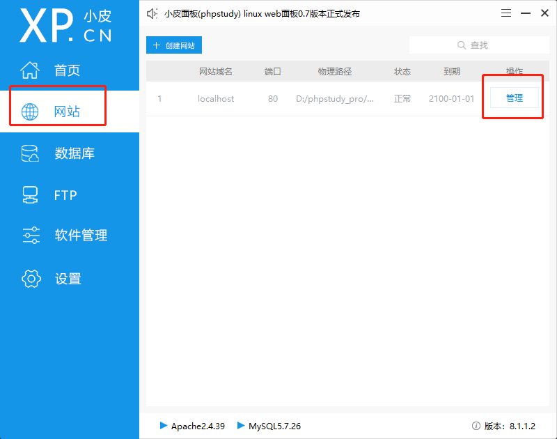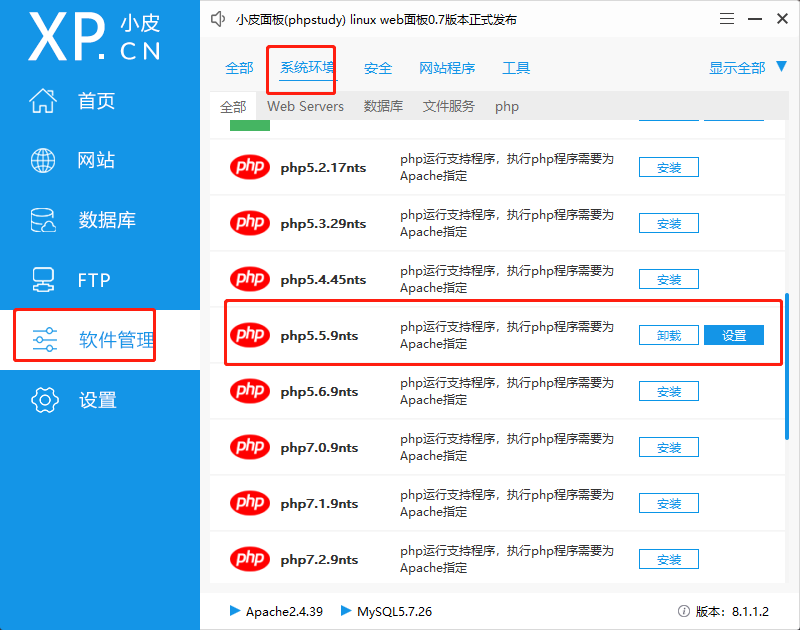 注意这个项目比较老,phpstudy 默认 php 是 7.3.9 的,所以得把 php 的版本换一下,换个5点几的版本。