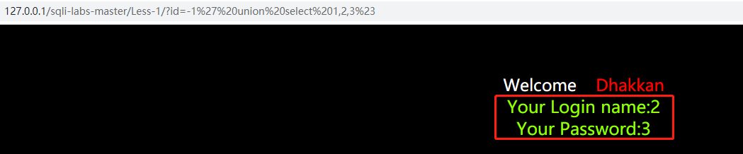 比如输入 ?id=-1' union select 1,2,3%23