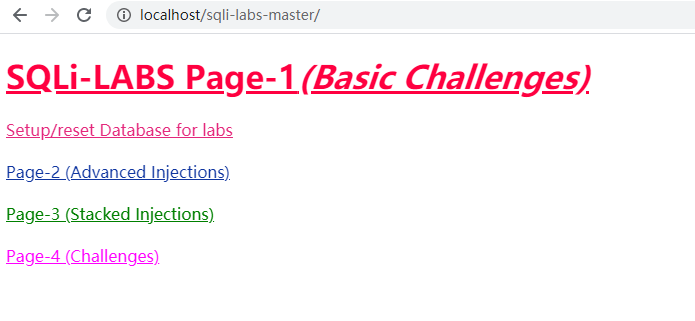 然后直接打开浏览器,访问http://localhost/sqli-labs-master/,即可看到下方页面。