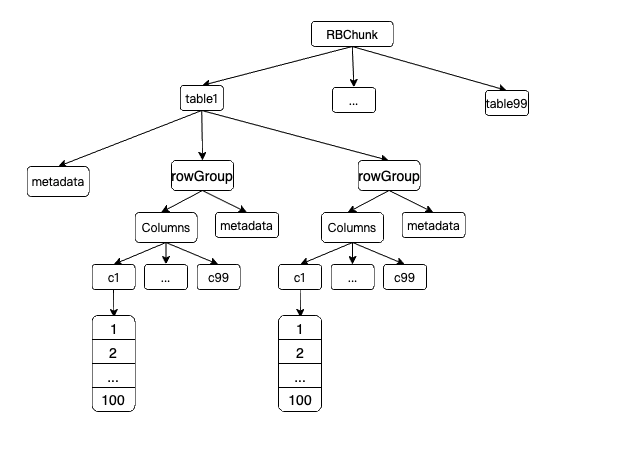 这里出现了两个metadata,第一个是表级别的,第二个是小块级别的,因为在写入过程中,有可能第一个chunk和第二个chunk的列不一样多,这样就在表级别存了一个最全的metadata。
