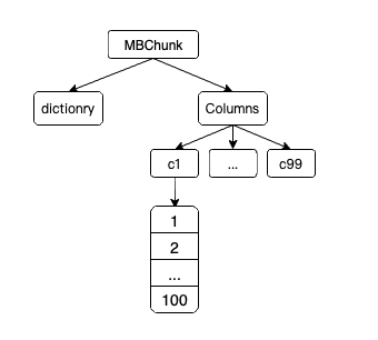 到了MbChunk之后,做了一次字典压缩,把field、tag等等的字符串都转为了id,然后使用列式存储,一列一列的存储下来。如图: